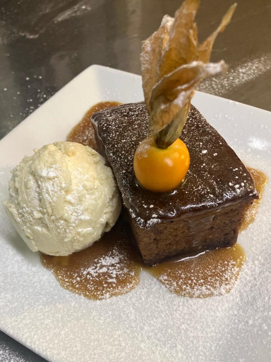 Sticky toffee pudding (or sticky date pudding) is a date-filled dessert and classic English-style pudding, consisting of moist sponge cake that is covered in a sweet toffee sauce. It is often served with fresh cream or chilly vanilla ice 9cream and is always a crowd-pleaser!